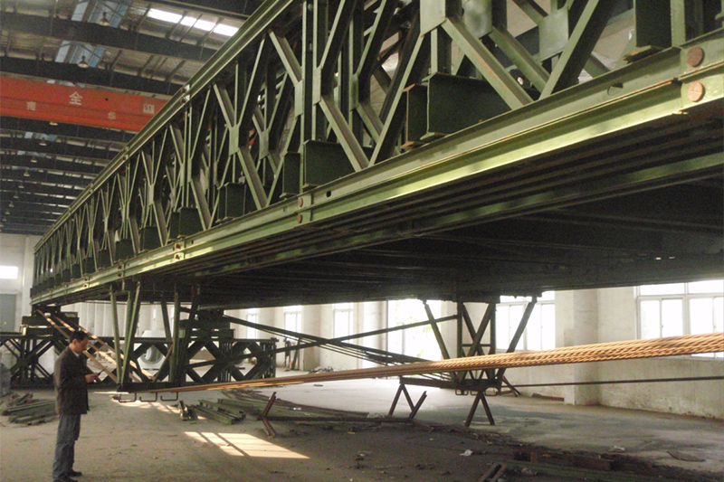 Our company, through joint efforts with 4 doctoral supervisors and a group of students from the Road and Bridge Engineering specialty of Nanjing University of Science and Technology, has successfully developed and trialed a large-span Bailey Bridge tension-jacking system. The experimental bridge model is 51m, with a load capacity of 60 tons. The Bailey Bridge structure is a Type 321 Triple-Row, Single-Story, Reinforced, single-lane structure. Originally, this structure at 51m reached its limit carrying only a few tons. However, through the counter-tension-jacking system jointly developed by our company and NJUST professors, this Bailey Bridge structure is enabled to satisfy the smooth passage of a 60-ton load. This has opened up entirely new prospective opportunities for the application scenarios of large-span, heavy-load Bailey Bridges. The aforementioned pictures show the process of our company's experiment, demonstration, processing, trial production, erection, and final acceptance.